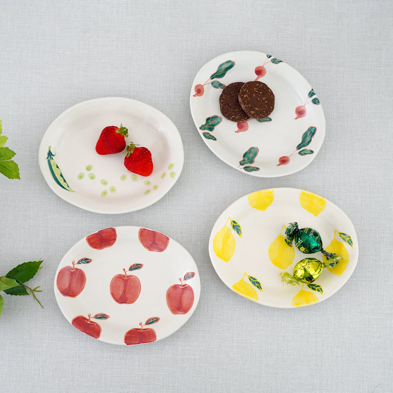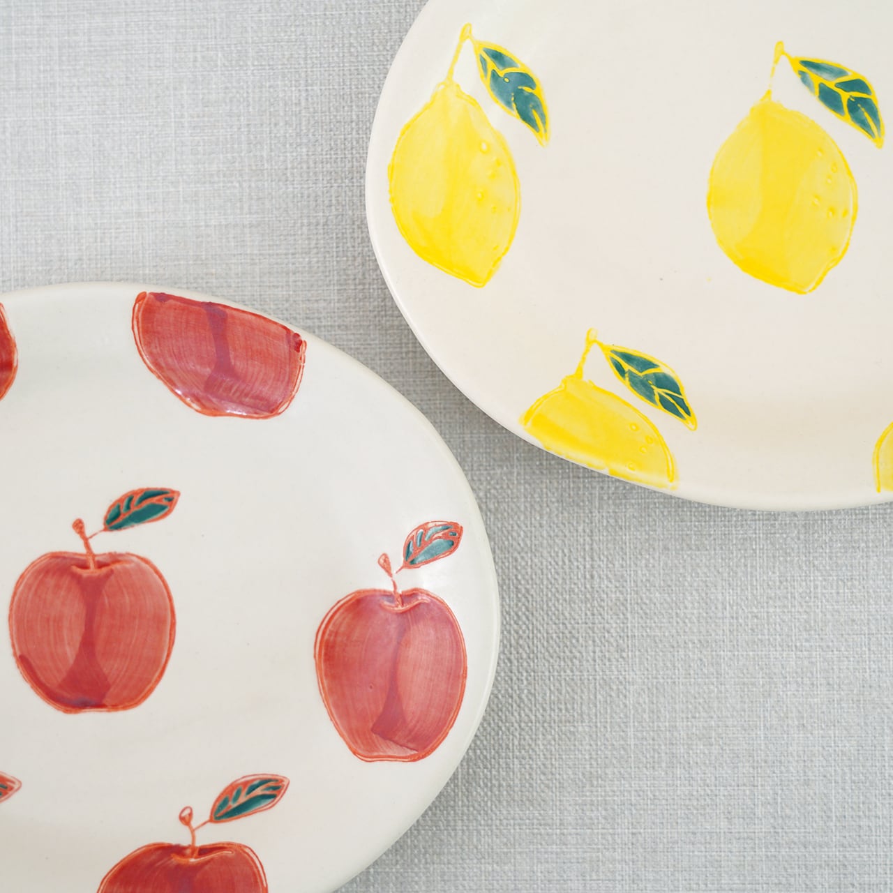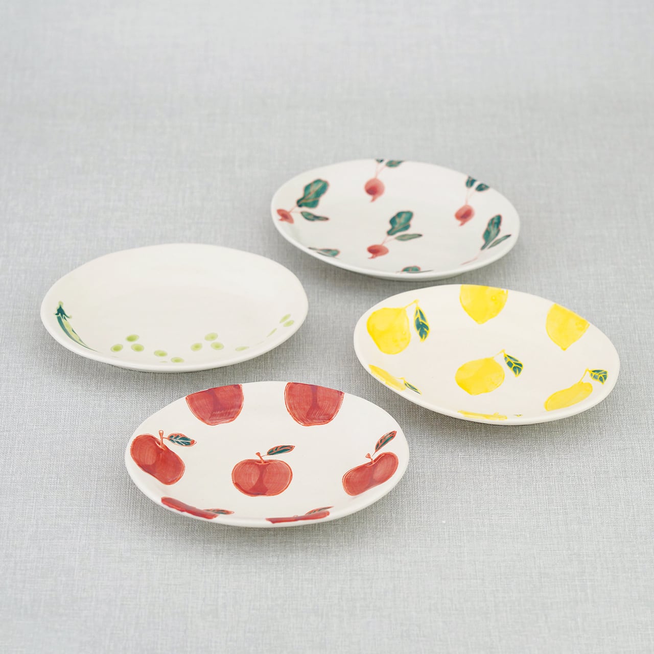 アイボリーのようなやわらかな生地に、愛らしいくだものや野菜のモチーフを描いたフレッシュアートシリーズ。